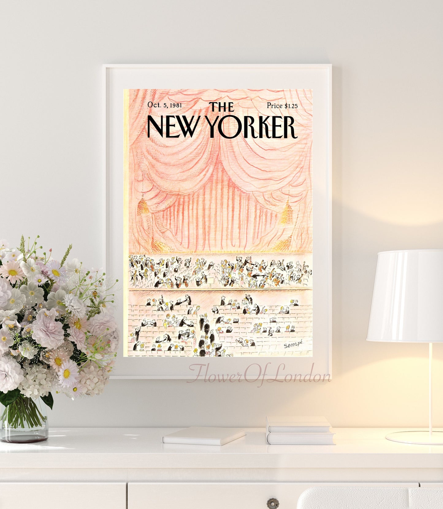 This New Yorker magazine cover from 5 October 1981 captures a grand theatre interior in soft, warm pastels. The scene offers a sweeping view of the auditorium from above, where tiny, finely detailed figures are scattered across plush seats, creating a tapestry of pre-show anticipation. The architecture, lighting, and subtle peach and pink palette convey a quiet, elegant atmosphere, making this print an enchanting addition to any space. Ideal for lovers of classic illustration, vintage interiors, and the quiet drama of cultural life. Ideal for girl's room or college dorm decor.
