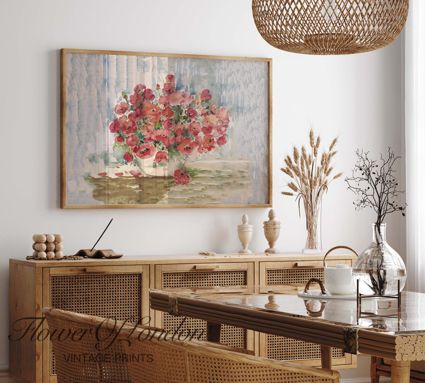 Red Poppies Bouquet Print, Vintage Neutral Still Life Wildflowers Vase Painting, #148